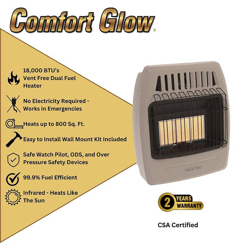 - POWERFUL HEATING PERFORMANCE: This Comfort Glow gas heater for indoor use delivers 18,000 BTUs of radiant heat, efficiently warming spaces up to 800 sq. ft., making it ideal for homes, offices, and garages.