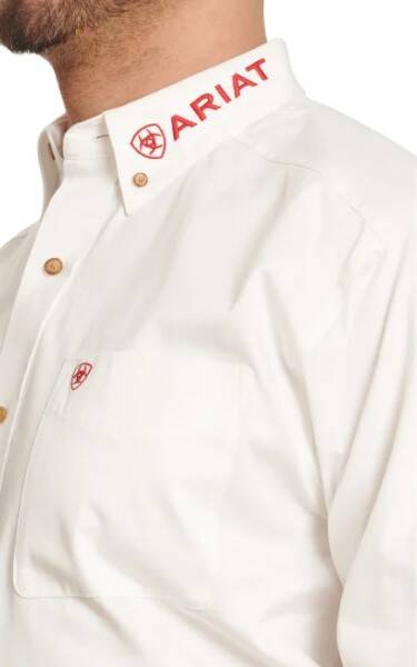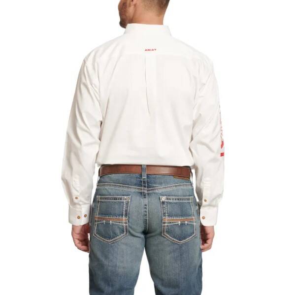 Ariat’s Men’s Team White & Mexican Flag Sleeve Logo Western Shirt embodies the perfect mix of tradition and style. Featuring the iconic Mexican flag logo on the sleeve, it brings a touch of patriotism to your Western wardrobe. Crafted from 100% cotton, this shirt offers comfort and breathability, making it ideal for all-day wear. The button collar, Ariat collar logo, and long sleeves create a sharp look, while the open chest pocket adds a practical touch. Available at Cavender’s, this shirt is a durable and stylish choice for anyone who wants to combine classic Western fashion with modern flair. Its high-quality construction ensures it will stand up to both casual and tough environments.