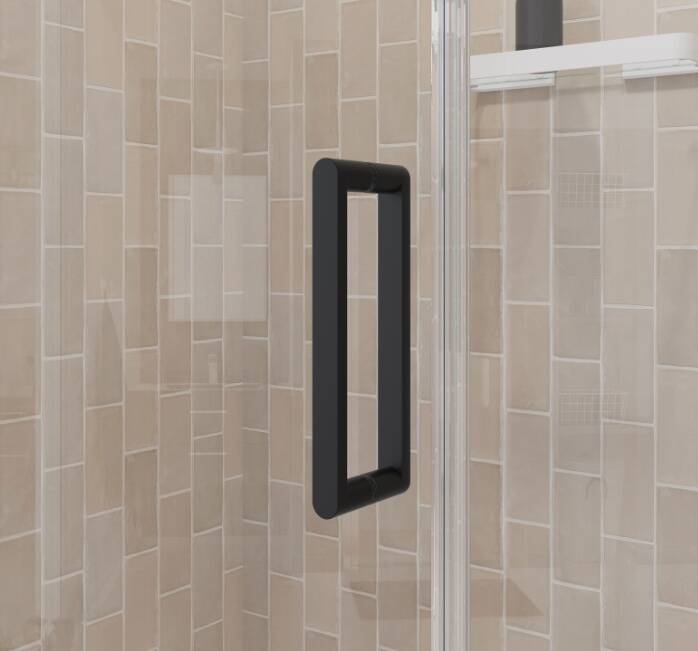 Manhattan frameless pivot door for alcove Installation With Clear Glass & Round Handle In Matte Black.