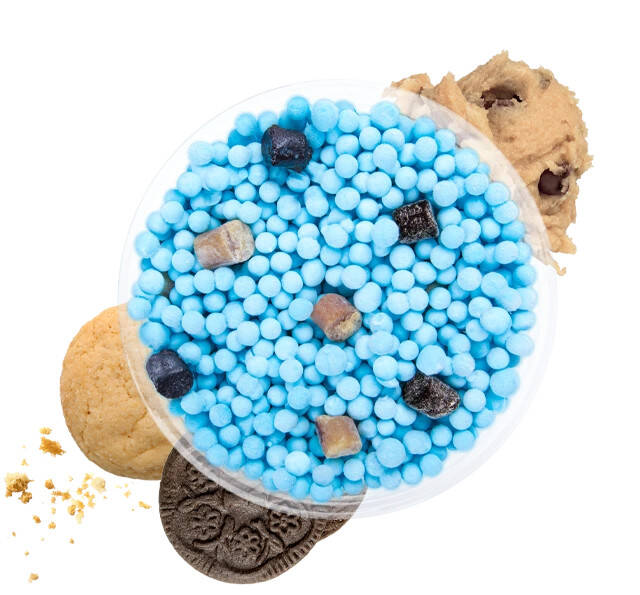Cookie Monster features blue Sugar Cookie flavored ice cream dots, packed with not one, but two delicious cookie doughs: Chocolate Chip Cookie Dough and Chocolate Sandwich Cookie Dough.