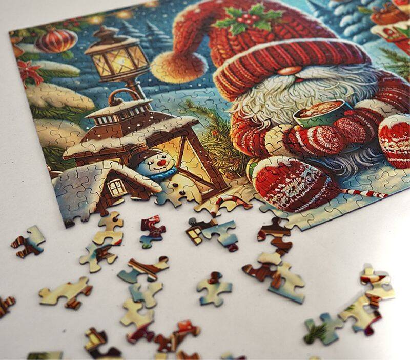 Embrace the warmth and charm of the holiday season with the "Hot Cocoa Season" 500-piece jigsaw puzzle. This delightful puzzle features an adorable gnome holding a cup of steaming hot chocolate topped with marshmallows, capturing the essence of cozy winter moments. Surrounding the gnome are festive Christmas presents, adding to the holiday cheer. An irresistible fuzzy kitten adds an extra layer of cuteness to the scene, while a glowing lantern casts a warm light against the backdrop of a serene snowy landscape. The peaceful, snowy setting invites you to relax and enjoy the simple joys of the season. Perfect for puzzle enthusiasts, families, and holiday lovers, "Hot Cocoa Season" offers hours of festive entertainment. Once completed, it becomes a heartwarming display piece that brings the spirit of Christmas into any home. Ideal for gifting or personal enjoyment, this puzzle is a must-have for anyone looking to celebrate the holiday season in a cozy, heartwarming way.
