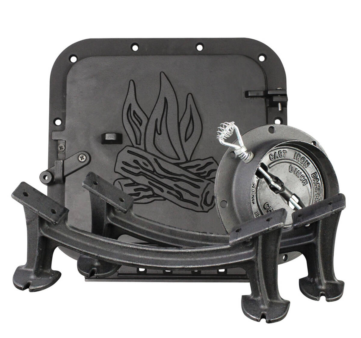 - ALL-IN-ONE KIT: Includes 2 legs, cast iron door with cam lock latch, flue collar with damper, and all mounting hardware