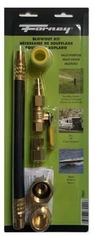 Gone are the time-consuming shopping trips attempting to create your own kit. Forney’s all-in-one Blowout Kit consists of everything you need including a 9” flexible air hose for those hard-to-reach back flow preventers and a shut off ball valve that conveniently opens and closes to build pressure.