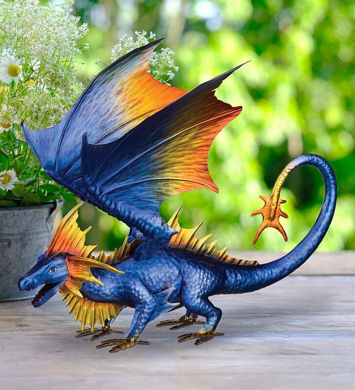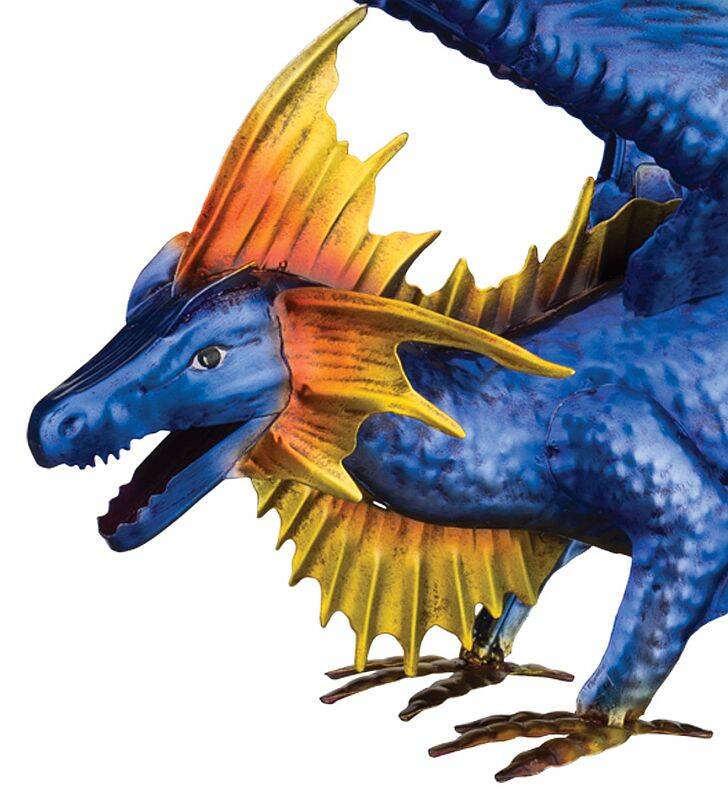 The 12-inch Dragon Decor is meticulously crafted from metal, with vibrant metallic paint that enhances the detailed features of its body and wings. Its swirling tail and menacing expression convey a sense of power and intensity. Suitable for both indoor and outdoor use, this piece combines durable craftsmanship with a striking, mythical aesthetic.