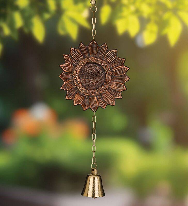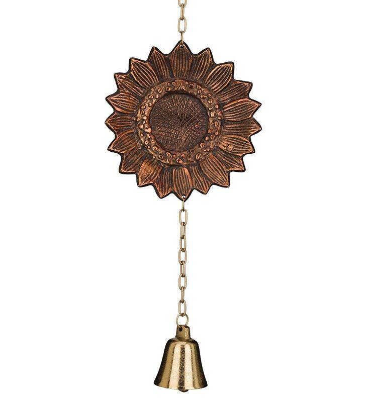 This cast aluminum Garden Bell features a Sunflower in deep bronze finish, capturing the intricate beauty of nature’s iconic flower. A soft sounding thick cast bell hangs from a durable chain, adding a peaceful ambiance to the garden.