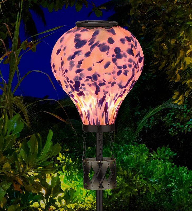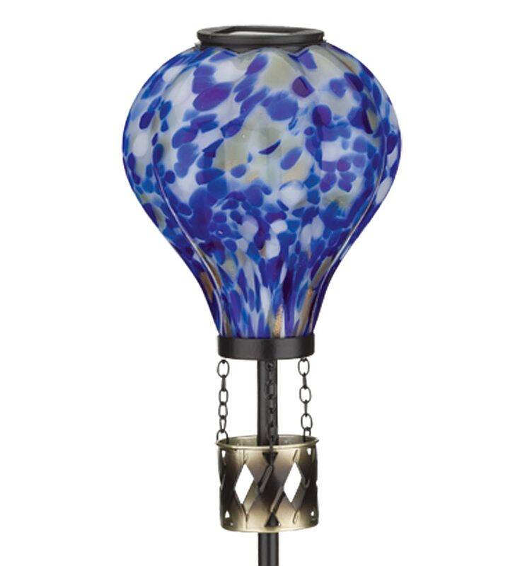 This thick glass Hot Air Ballon solar stake has the beautiful colorful Murano glass styling. A solar-powered LED turns on at night, emitting a flickering light mimicking the flame in a real Hot Air Balloon.