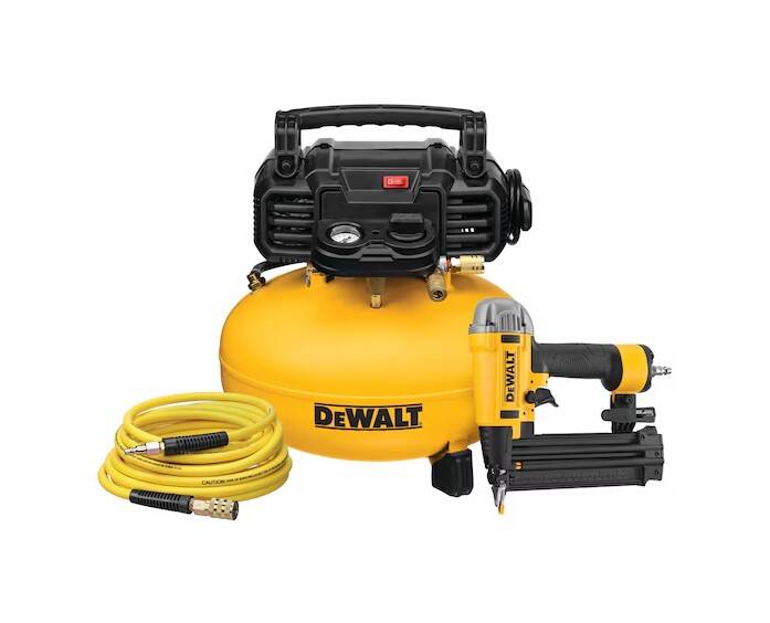 Includes (1) DWFP12233: Precision Point 18 Ga 2-1/8 in Brad Nailer (1) 25 feet of 1/4 in Air Hose With a Coupler and Plug (1) DWFP55126: 6 gal 165 PSI Pancake Compressor