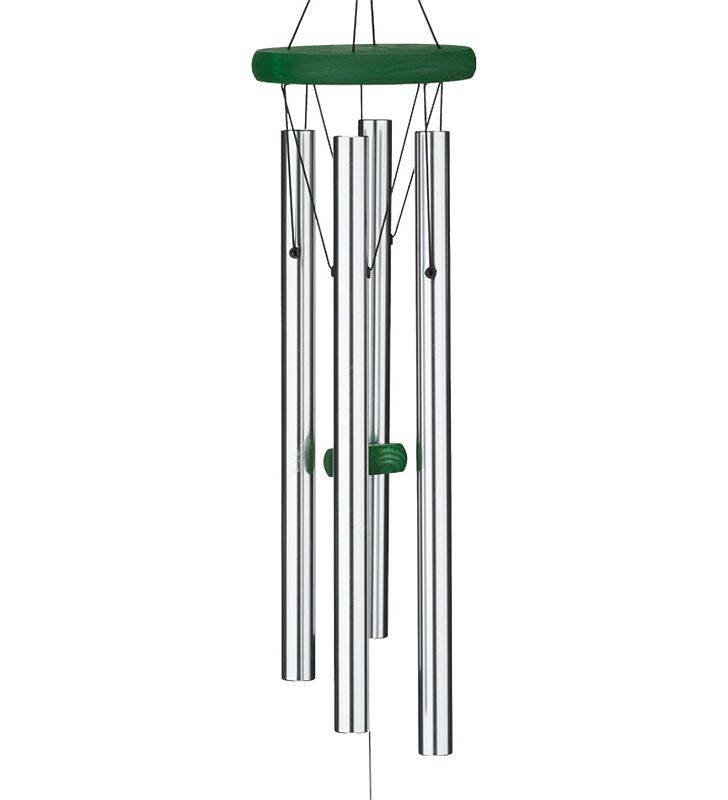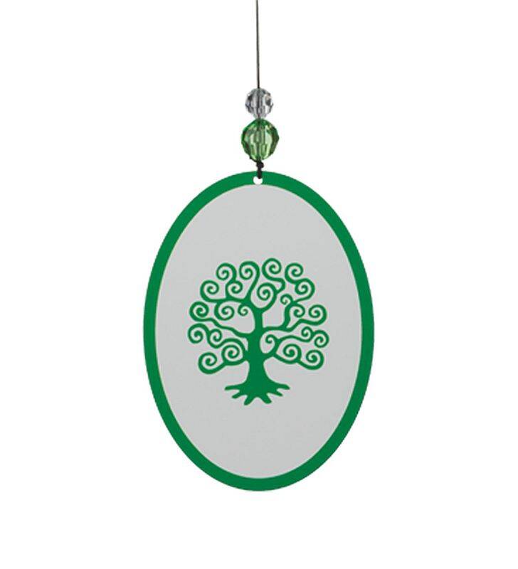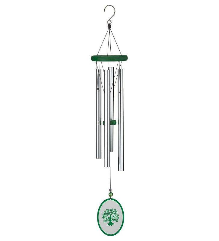 Brightly styled chime featuring a wooden canopy and knocker painted in a rich green tone. Has an acrylic sail with matching color silhouette Tree of Life and bright silver aluminum alloy tubes. Watch as the Tree of Life sail glistens in the light, while the chimes intone the wind.