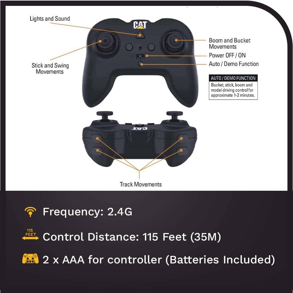 • Fully Functional Radio Controlled Frequency: 2.4G Light & Sound functions Auto Demo Functions Individual movements of front arm & rear arm, buckets, and rotational body