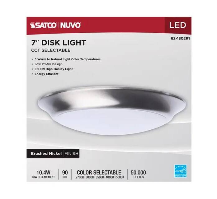 7 Inch LED Disk Light; 27K/3K/35K/4K/5K CCT Selectable; Brushed Nickel Finish