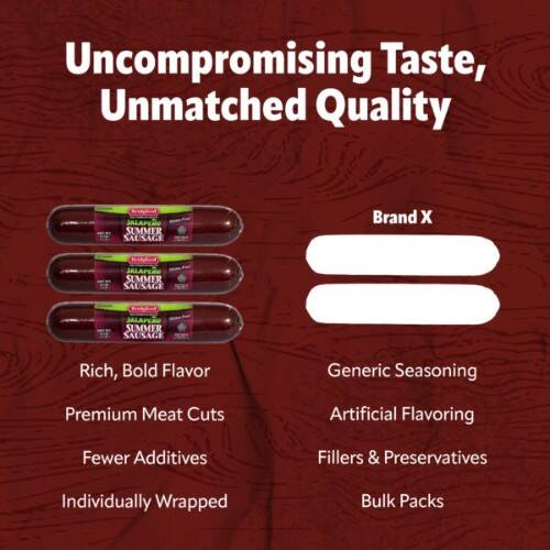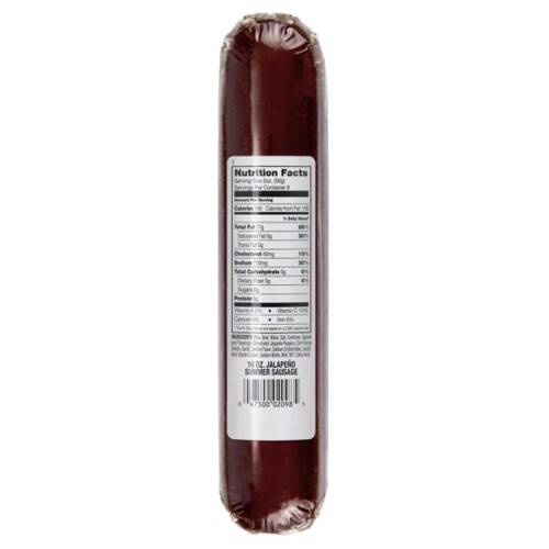 | Ingredients | Pork, Beef, Water, Salt, Dextrose, Spices and Flavorings, Dehydrated Jalapeno Peppers, Corn Syrup Solids, Garlic, Smoke Flavor, Sodium Erythorbate, Lactic Acid Starter Culture, Sodium Nitrite, BHA, BHT, Citric Acid. |