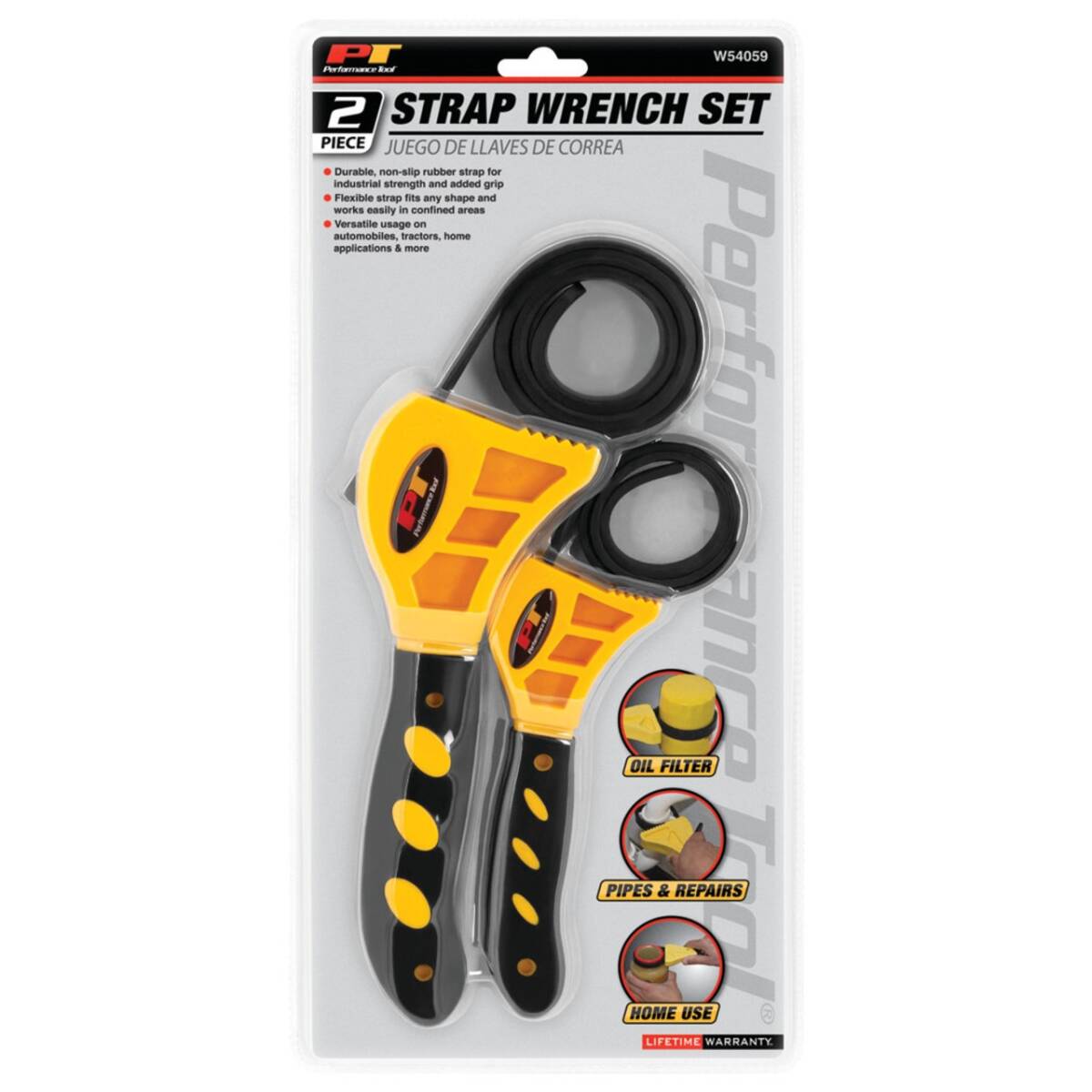 Two-piece strap wrench set featuring a non-slip rubber strap and a flexible strap that fits any shape. Fits items up to 6 1/2" in diameter.
