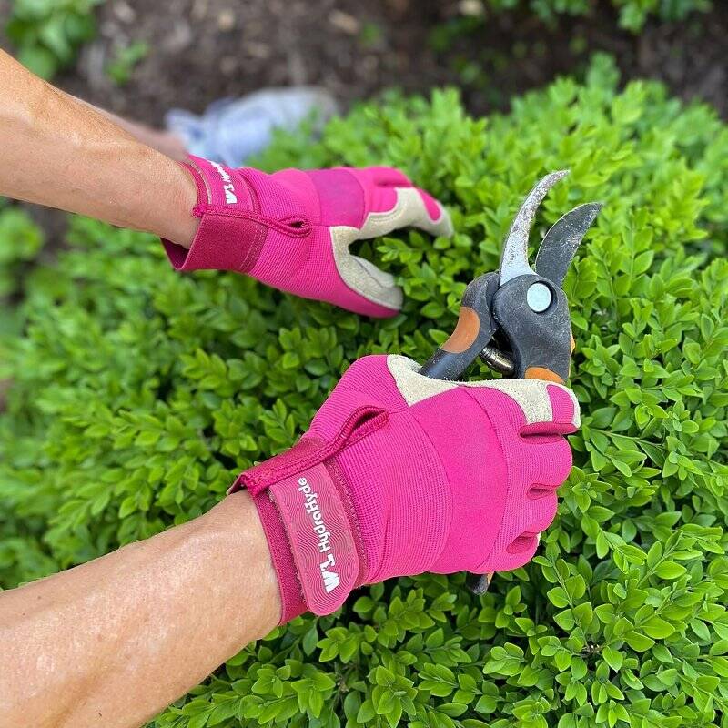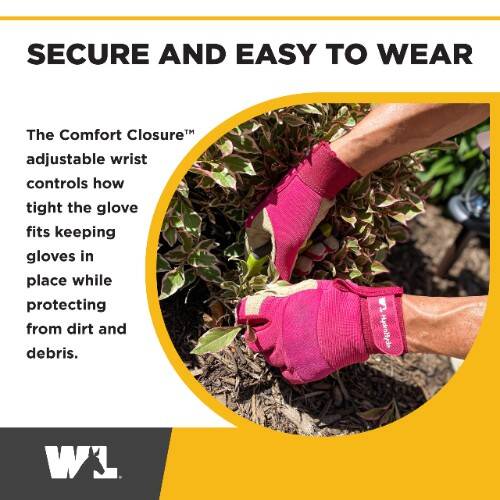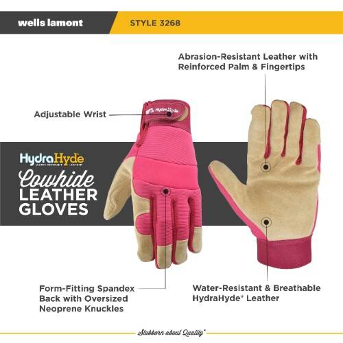 Now you can work harder and longer with our split leather water-resistant HydraHyde® work gloves from Wells Lamont. Not only will they keep your hands dry and safe with a water-resistant and puncture-resistant split leather palm, they will also fit great with an adjustable wrist closure. These Women's leather palm hybrid gloves have reinforced fingers tips and a neoprene knuckle lining for toughness and durability. Garden, landscape, farm and more with our women's HydraHyde® hybrid leather palm work gloves.
