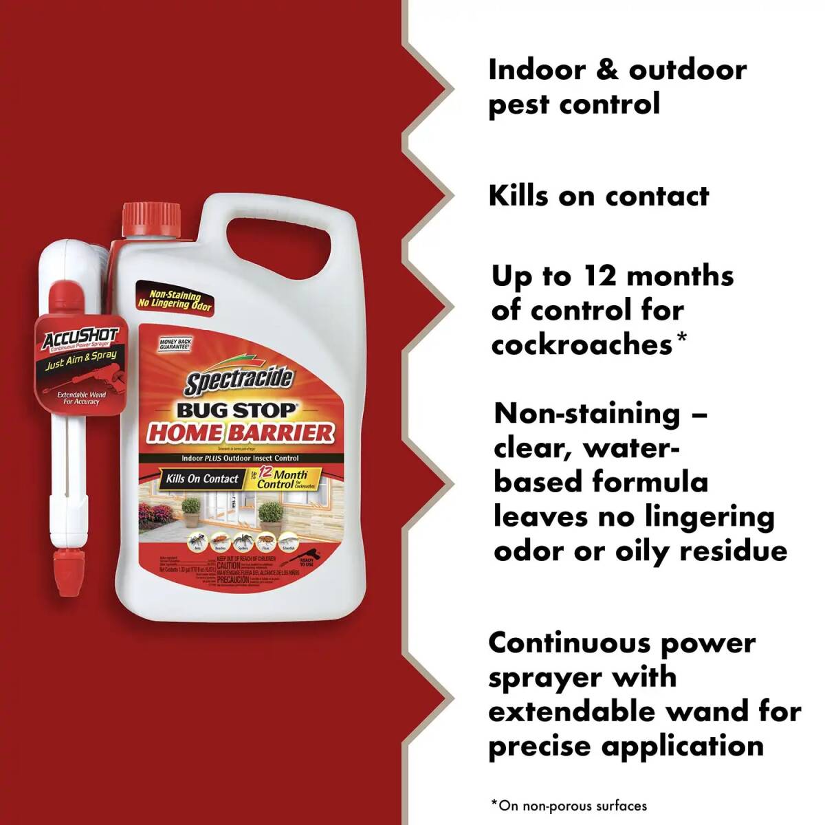 Spectracide® Bug Stop® Home Barrier with AccuShot® sprayer kills on contact to provide indoor and outdoor insect control. Plus, it provides up to 12 months of control for cockroaches on non-porous surfaces.