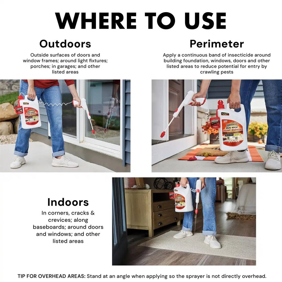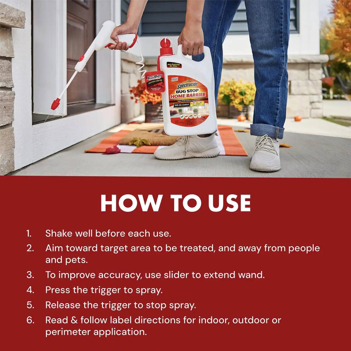 This water-based, clear formula leaves no odor or oily residue. The AccuShot® wand reduces hand fatigue with a continuous action power sprayer – no pumping or squeezing, just press to spray. This battery powered wand is also extendable for improved accuracy. Convenient and easy to use, Spectracide® Bug Stop® Home Barrier formula kills insects indoors where they hide and outdoors as a foundation treatment or where insects may enter.