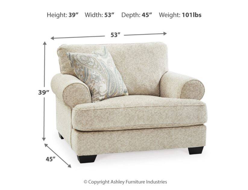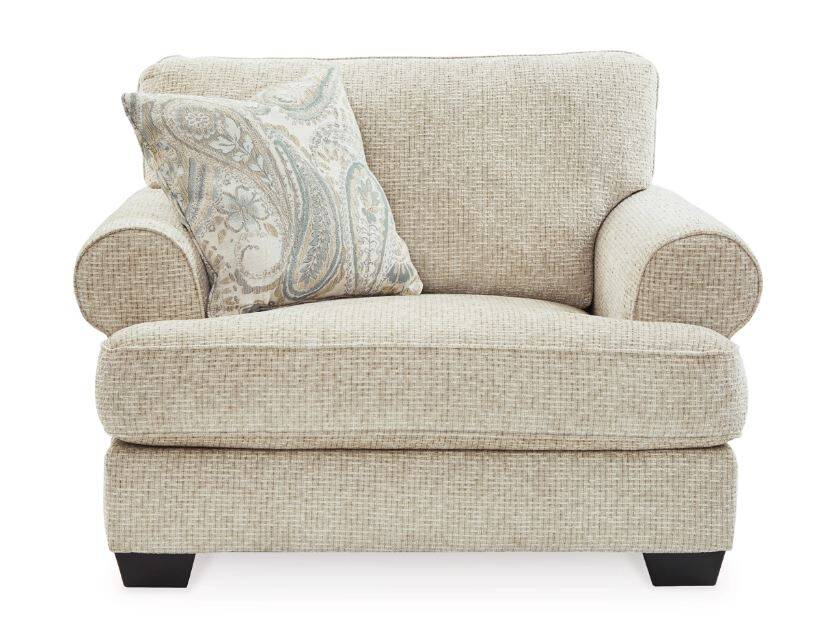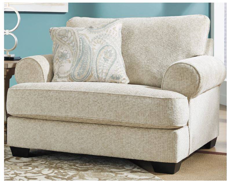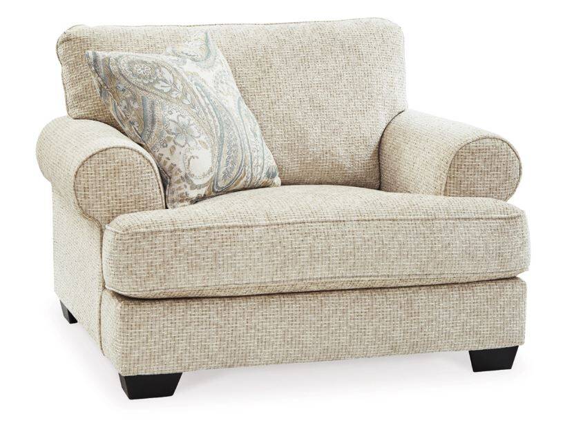 The Monaghan oversized chair strikes a beautiful balance between classic and current. Its traditional elements include t-cushion seating and setback roll arms, angled for modern flair. A jacquard paisley pillow makes a muted, mellow complement to the chair’s casual textured chenille upholstery. And the choice of sandstone beige is a light and lovely style awakening.