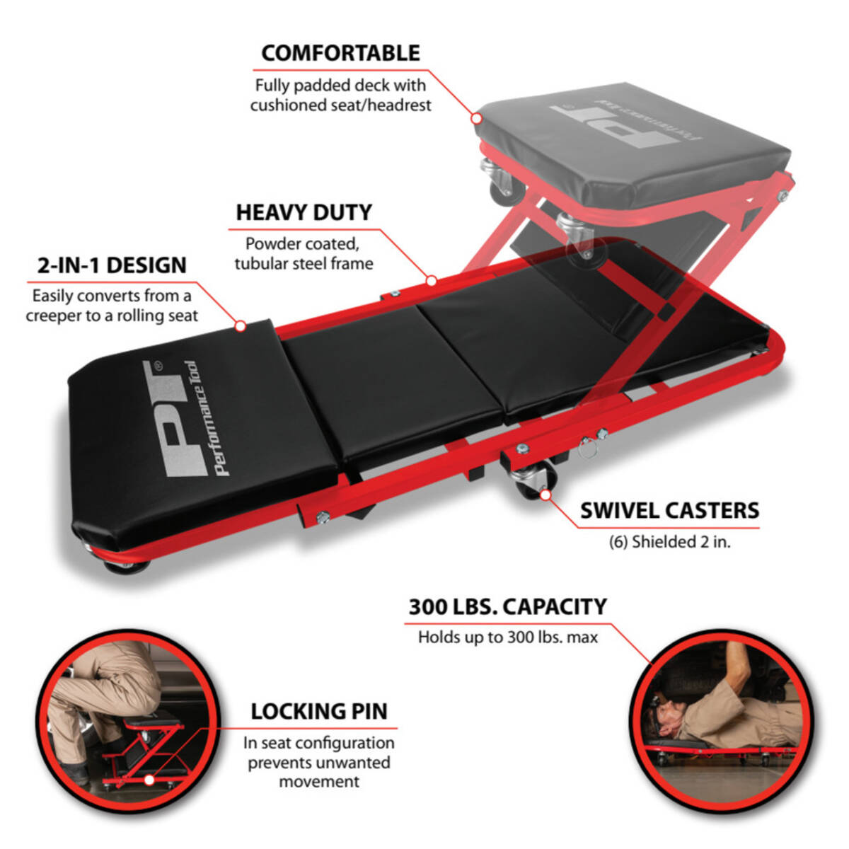 • Easily converts from a creeper to a rolling seat