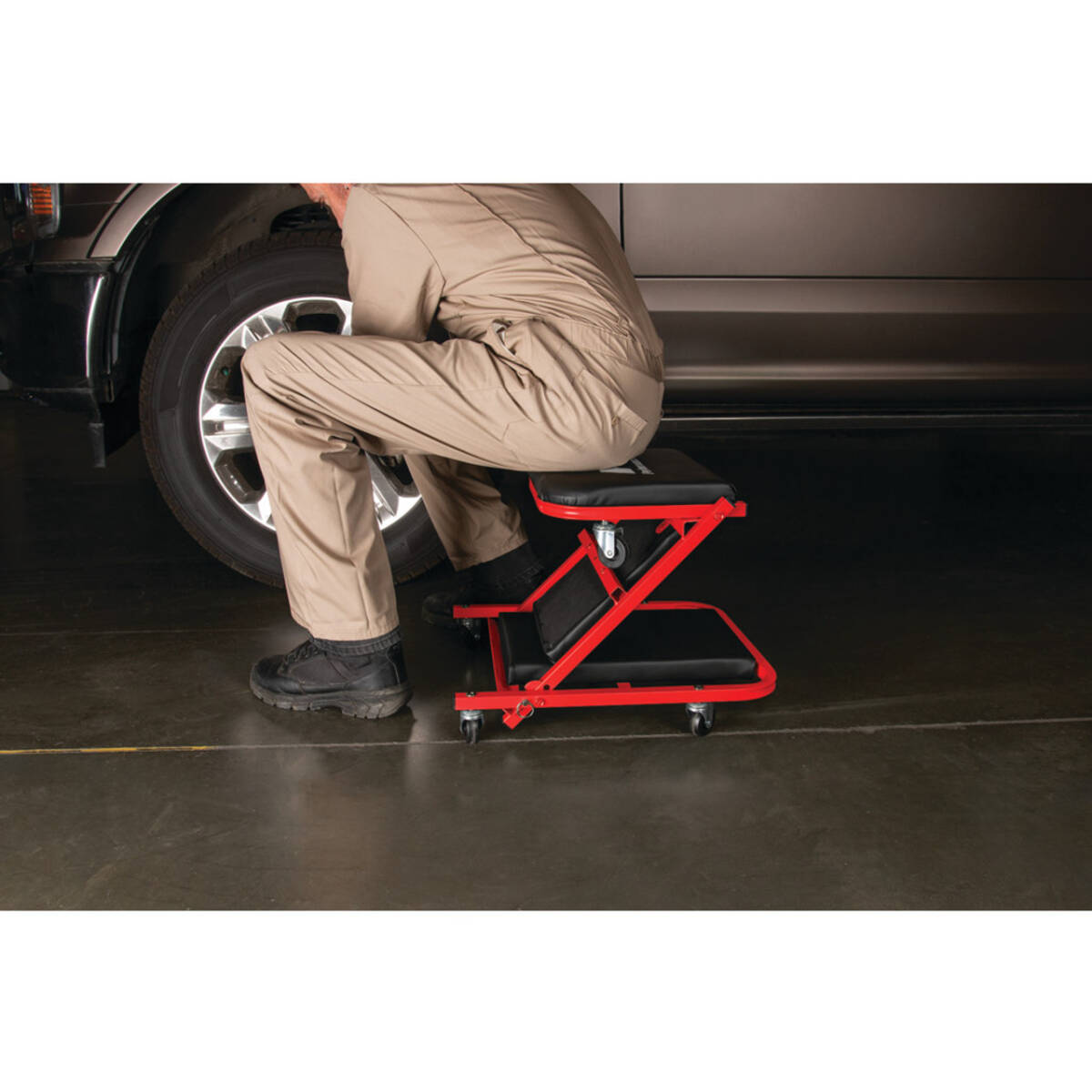 This z-frame creeper converts in seconds from a creeper to a rolling seat. Low-profile for easy access under vehicles.