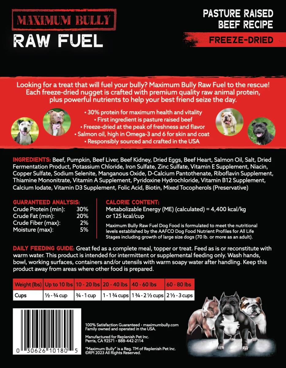 Looking for a complete and balanced diet, topper or treat that will fuel your bully? Try Maximum Bully Raw Fuel.