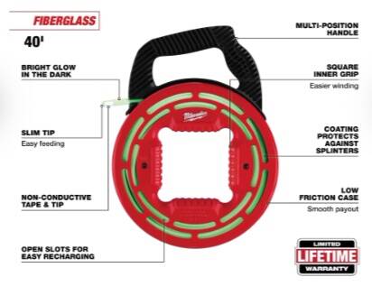 Our 40 foot Glow Fish Tape delivers easier fishing and bright glow in low light applications. A low-friction case delivers a smooth payout and easy rewind. The open slots throughout the case allow light to easily charge the tape resulting in a bright glow in the dark. The fish tape features a multi-position handle providing comfortable use in multiple scenarios. The non-conductive tape allows for safely handling wire and cable in electrical applications and the compact size allows for easy storage and transportation on and off the jobsite.