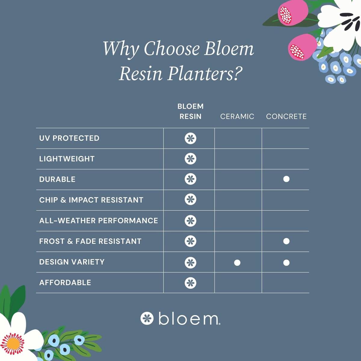 - Made from UV-resistant, BPA-free resin plastic.