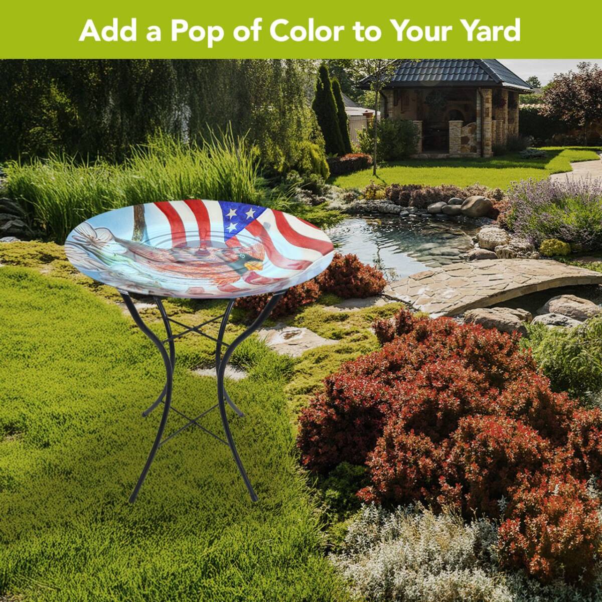 Measures 18" x 18" x 23". Provide a beautiful gathering space in your yard or patio for all your feathered friends with this artisan crafted glass birdbath from Briarwood Lane. This brightly colored glass birdbath provides a cheerful bathing place for all types of birds while also adding a pop of color to your home. Fill this birdbath with water or with seed to transform it into a colorful feeder. Constructed from thick, colorful glass and with an included folding metal stand, the bird bowl is built for years of quality outdoor use. The sturdy metal legs provide stability and prevent tipping when multiple birds gather on the bowl.