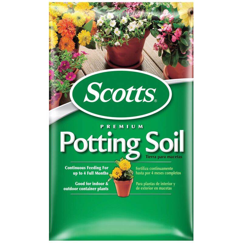 Scotts Premium Potting Soil with Fertilizer for bigger and more beautiful plants! Feeds for up to 4 months. Excellent for potting or repotting foliage, tropical and flowering houseplants as well as potted vegetables and herbs.