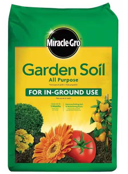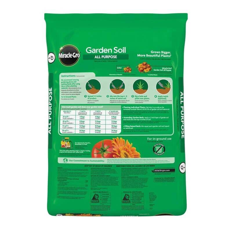 Grow bigger, more beautiful plants* with Miracle-Gro® Garden Soil All Purpose. This soil for in-ground use feeds plants for up to 3 months and improves existing soil to build strong roots. Use with your outdoor in-ground plants, including flowers, annuals, perennials, trees, and shrubs. To apply, spread 2-3 inches of soil in your garden bed or other in-ground area. Mix into the top 6-8 inches of native soil. Dig a hole and plant your new plants. When planting individual plants, dig hole 2x as wide as the container or root ball, and blend a 50:50 mix of garden soil and native soil. To amend garden beds, apply a 3-inch layer of garden soil and work into the top 6 inches of soil. Four 1 cu. ft. bags of Miracle-Gro® Garden Soil All Purpose cover 24 sq. ft. of garden at 2-in. depth of soil applied, or six bags for a 3-in. depth of soil applied. *Vs. unfed plants