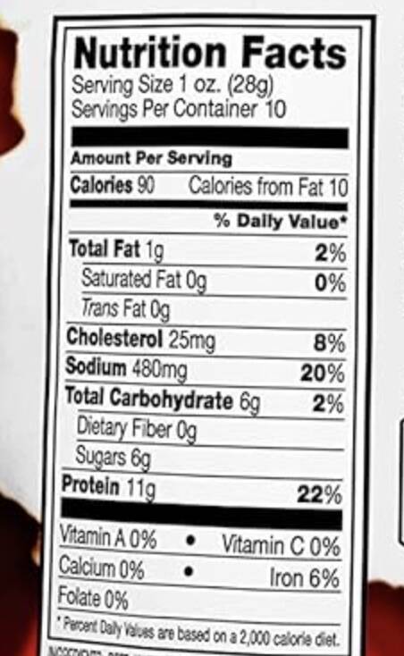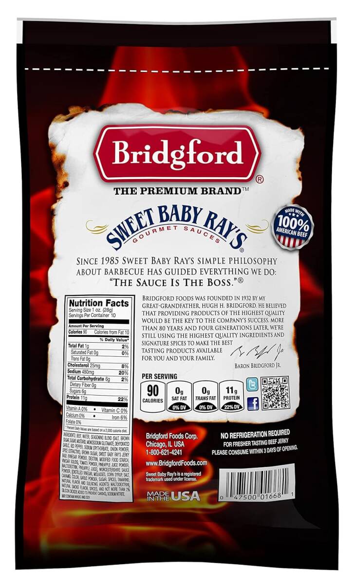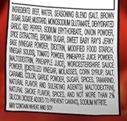 | Ingredients | eef, Water, Seasoning Blend (Salt, Brown Sugar, Sugar, Mustard, Monosodium Glutamate, Dehydrated Garlic, Red Pepper, Sodium Erythorbate, Onion Powder, Spice Extractive), Brown Sugar, Sweet Baby Ray’s Jerky Base (Vinegar Powder, [Dextrin, Modified Food Starch, Vinegar Solids], Tomato Powder, Pineapple Juice Powder, [Maltodextrin, Pineapple Juice], Worcestershire Sauce Powder, [(Distilled Vinegar, Molasses, Corn Syrup, Salt, Caramel Color, Garlic Powder, Sugar, Spices, Tamarind, Natural Flavor and Sulfiting Agents), Maltodextrin], Natural Smoke Flavor, Spices, and Not More than 2% Silicon Dioxide Added to Prevent Caking), Sodium Nitrite. May contain wheat and soy. |