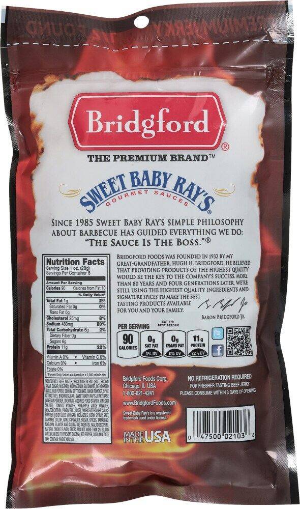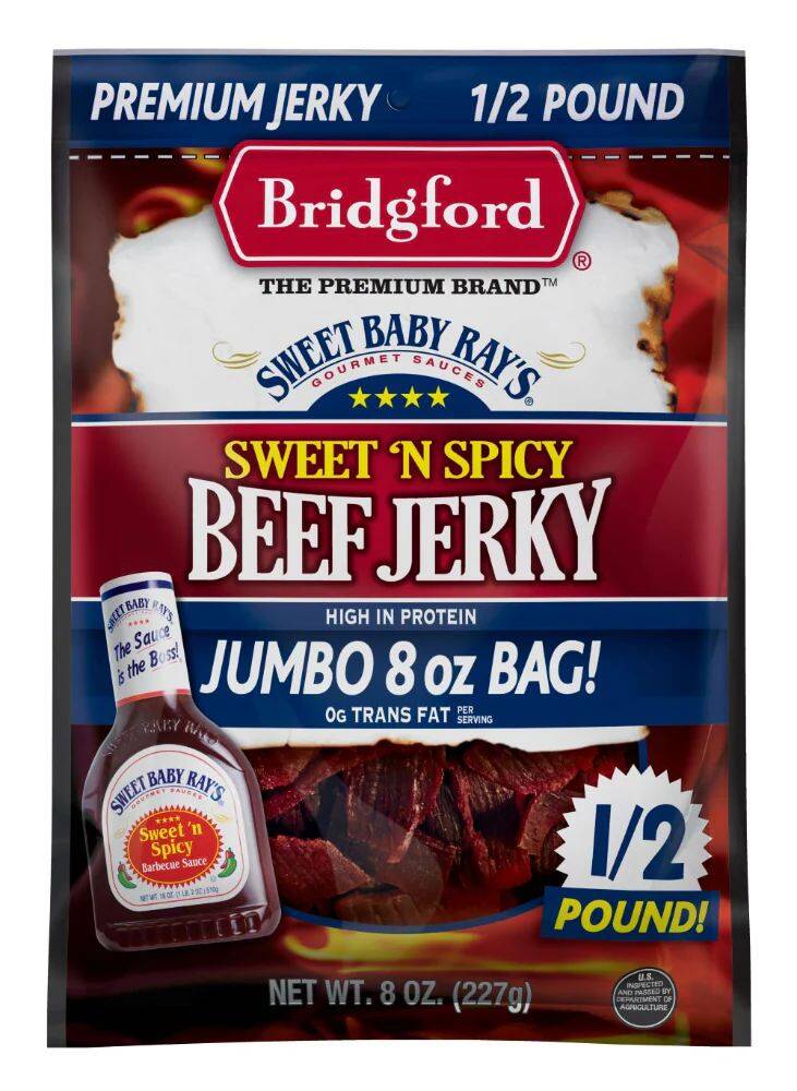 | Ingredients | Beef, Water, Seasoning Blend (Salt, Brown Sugar, Sugar, Mustard, Monosodium Glutamate, Dehydrated Garlic, Red Pepper, Sodium Erythorbate, Onion Powder, Spice Extractive), Brown Sugar, Sweet Baby Ray's Jerky Base (Vinegar Powder, [Dextrin, Modified Food Starch, Vinegar Solids], Tomato Powder, Pineapple Juice Powder, [Maltodextrin, Pineapple Juice], Worcestershire Sauce Powder [{Distilled Vinegar, Molasses, Corn Syrup, Salt, Caramel Color, Garlic Powder, Sugar, Spices, Tamarind, Natural Flavor and Sulfating Agents}, Maltodextrin], Natural Smoke Flavor, Spices and Not More than 2% Silicon Dioxide Added to Prevent Caking), Red Pepper, Sodium Nitrite. |