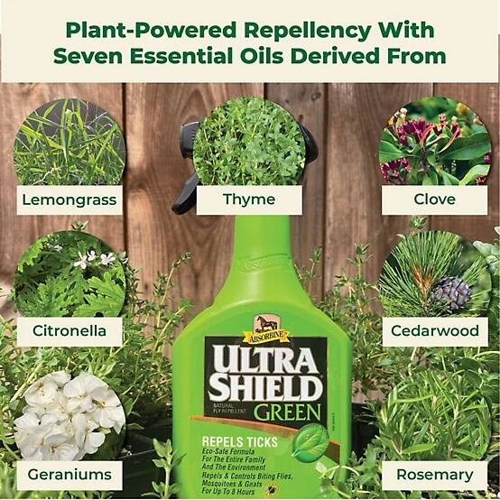 Absorbine Ultra Shield Green Natural Insect Repellent keeps flies, gnats, mosquitos and ticks off of your dogs and horses. Formulated from 7 essential oils known for fly-repellent qualities.