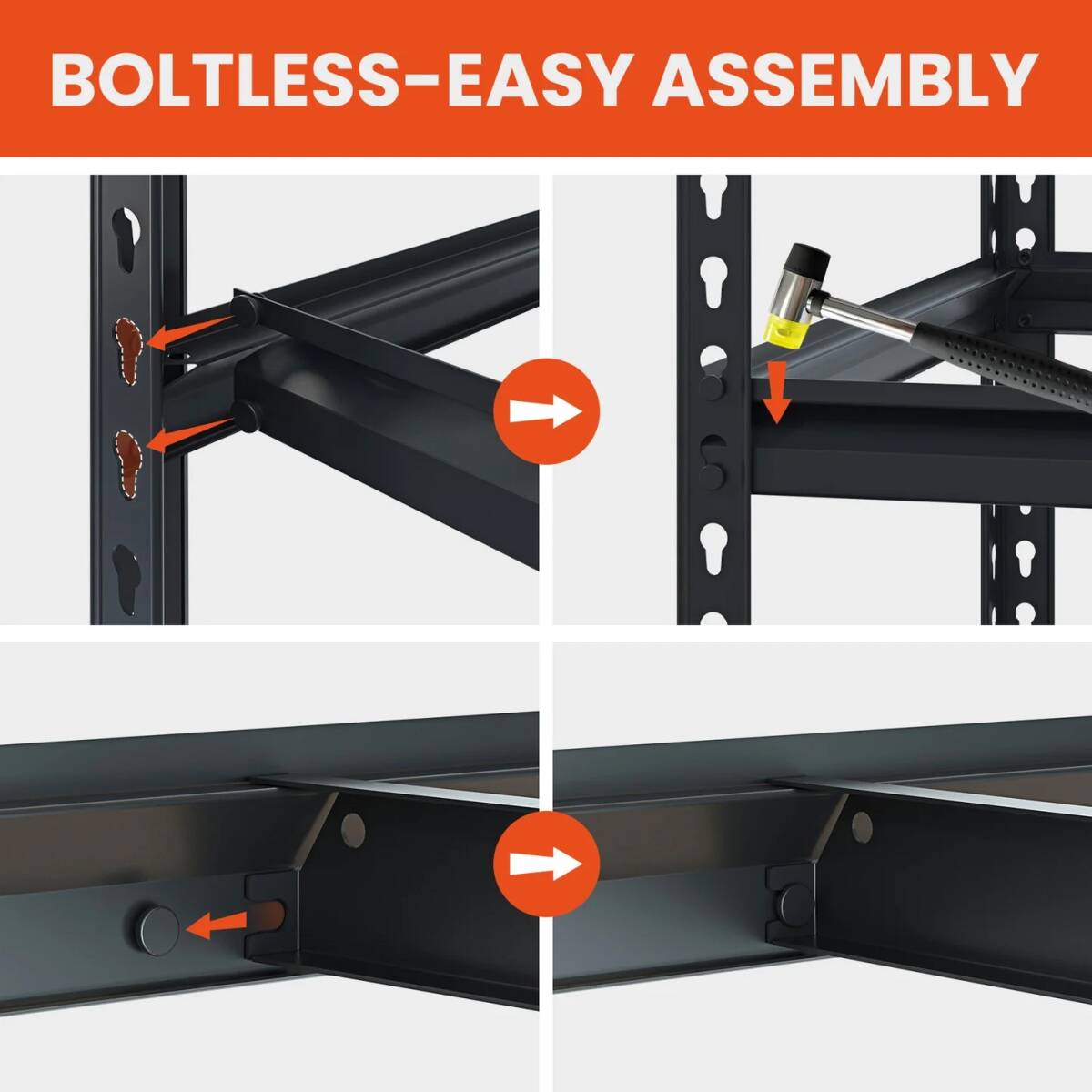 • No bolts, no screws, no headaches. Our innovative interlocking design allows for a quick, frustration-free setup. Just use a rubber mallet to snap the secure locking mechanism into place for a stable, wobble-free metal shelving unit.