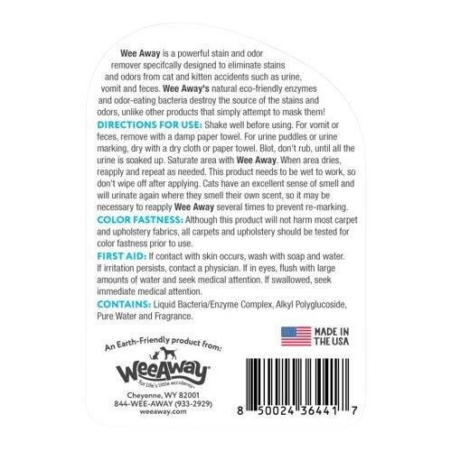 Wee Away X2 is an ultra-concentrated odor and stain remover specifically designed to eliminate the signs of cat and kitten potty accidents, vomit, food, grass stains and more. Unlike many products that simply mask odors and stains, it’s formulated with natural bacteria that deploy eco-friendly enzymes that tackle stink at its source. Has a delightful ocean inspired scent.