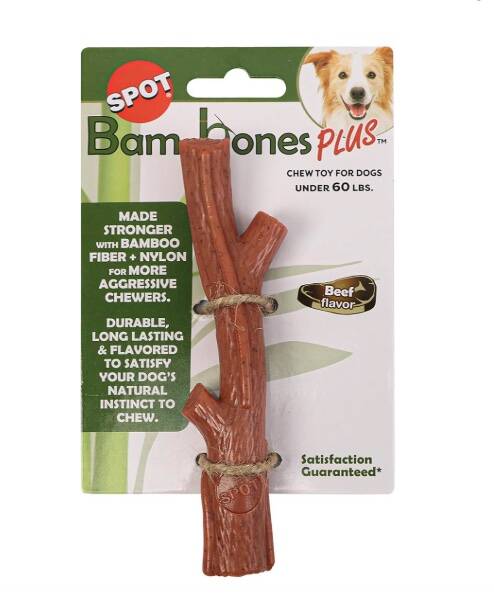 SPOT Bam-Bones Plus Branch is a nylon and bamboo fiber chew toy suitable for aggressive chewers.