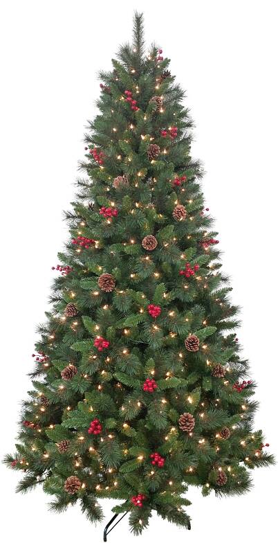 Pre-lit, 7.5 ft hard needle tree with 1091 tips, 500 incandescent clear lights, UL direct plug, regular pinecones, red berries, hinged branches and a metal stand.