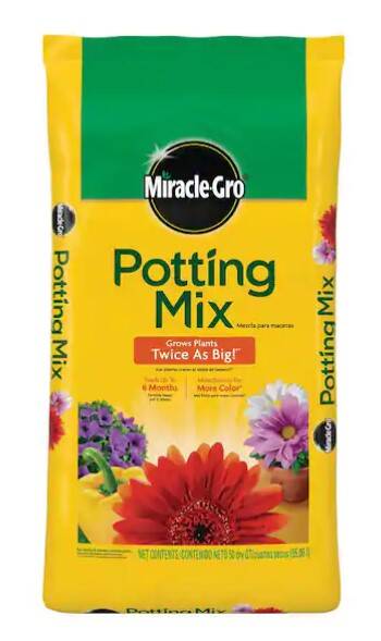Cultivate a beautiful array of container plants with Miracle-Gro® Potting Mix. This potting soil mix Grows Plants Twice As Big!®* In addition, the added fertilizer feeds all types of container plants for up to 6 months. With this gardening product, you can expect more blooms for more color*. This container mix works best with outdoor container plants, including your favorite flowers, annuals, perennials, vegetables, and shrubs. To apply, select a pot with a drain hole. Fill the pot about 1/3 full with potting soil. Loosen the root ball of your plant and place it in the pot. Add more potting mix and press lightly to level. Water your plant and let it drain. For optimal results, refer to plant tags for specific sun and shade needs. Let mix dry to the touch between waterings; do not allow plants to sit in drainage water.