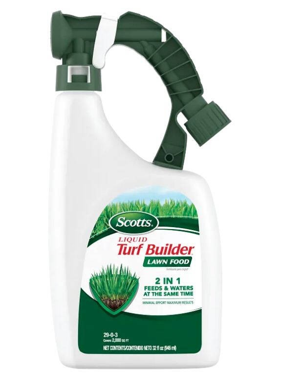 Scotts® Liquid Turf Builder® Lawn Food contains the essential nutrients and feeding power lawns need for great results. This 2-in-1 liquid fertilizer makes it easy to feed and water your grass at the same time. Apply this grass fertilizer to actively growing turf. This lawn care product can be applied to any grass type. One 32 fl. oz. bottle of Scotts® Liquid Turf Builder® Lawn Food covers 2,000 sq. ft.