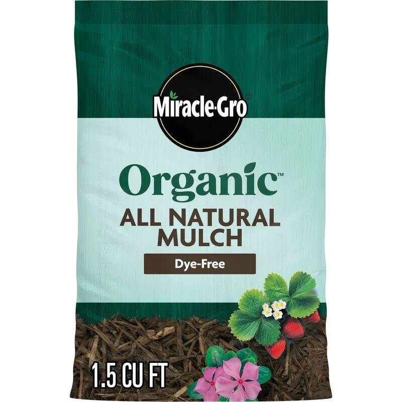 Beautify your landscape with Miracle-Gro Organic™ All Natural Mulch. Our locally made mulch* contains dye-free sustainable wood and can be used around edible gardens. When used in a 3-inch layer, this mulch naturally prevents weeds by blocking growth and access to sunlight. In addition, this landscaping product is safe to use around kids and pets. This product is OMRI Listed for organic use, and the packaging includes recycled materials. Use Miracle-Gro Organic™ All Natural Mulch around trees, shrubs, flowers, or vegetables. Avoid use around underdeveloped plants, before flower and vegetable seeds have germinated, directly against tree trunks, and within several inches of house foundations or other wood structures. One 1.5 cu. ft. bag of Miracle-Gro Organic™ All Natural Mulch covers approximately 6 sq. ft. when applied in a 3-inch layer.