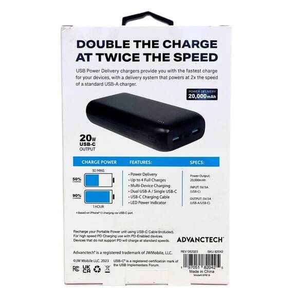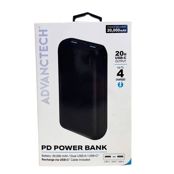 Stay powered up on the go with the Advanctech 20,000 mAh PD Power Bank in black, designed with dual USB-A ports and a USB-C port for charging up to three devices at once. Delivering 20W USB-C output with Power Delivery technology, this high-capacity charger provides up to 4 full charges and powers devices at twice the speed of standard chargers. Compact yet powerful, it includes a USB-C charging cable, LED power indicator, and multi-device compatibility, making it perfect for smartphones, tablets, and more.