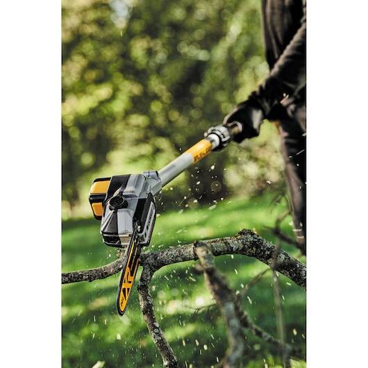 The DEWALT 20V MAX* XR Brushless Cordless Pole Saw comes equipped with an 8 in. Bar and Chain to handle all of your pruning needs. It features a high efficiency brushless motor that delivers up to 96 cuts per charge.** The well balanced design and durable pole shaft extends up to 10 ft. for a total reach of up to 15 ft.† It has an auto oiling feature for added convenience and time saving. It also features metal bucking strips for a durable cutting grip and a tree hook allows you to easily remove pruned branches.