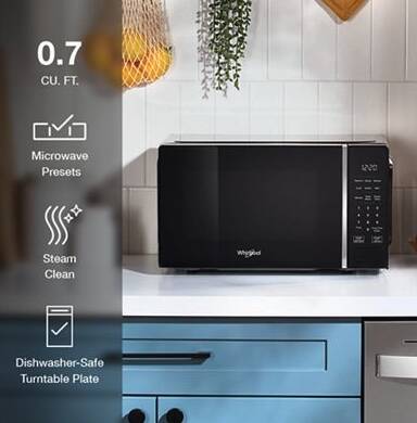 0.7 cu. ft. Black Countertop Microwave With Steam Clean - 700 watt. Fit all your essentials in this 0.7 Cu. Ft Capacity countertop microwave with a White LED Display and Electronic touch controls for a modern easy-to-use design. This 700 watt microwave has 10 Power Levels that adjusts to your recipes and simplifies cleanup with its Dishwasher-Safe Turntable Plate and Steam Clean.