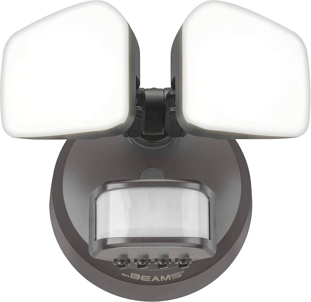 Mr Beams Wired Pro 2-Head Motion Security Light provides powerful home security lighting in traditional areas around the home with innovative new features. The spotlights two heads provide a combined 2700 lumens of motion-activated light in areas like garages, decks, eaves and any other area to mount to an existing junction box. Four lighting modes address a variety of lighting needs, including Auto Mode for motion activation; On Mode for activation through the home light switch; D2D Mode for continuous dusk-to-dawn activation; and Test Mode for adjusted settings to test the light during setup. Adjustable motion detection, auto shut off and light sensitivity settings allow for customizable home security lighting. Equivalent to 200 watts.
