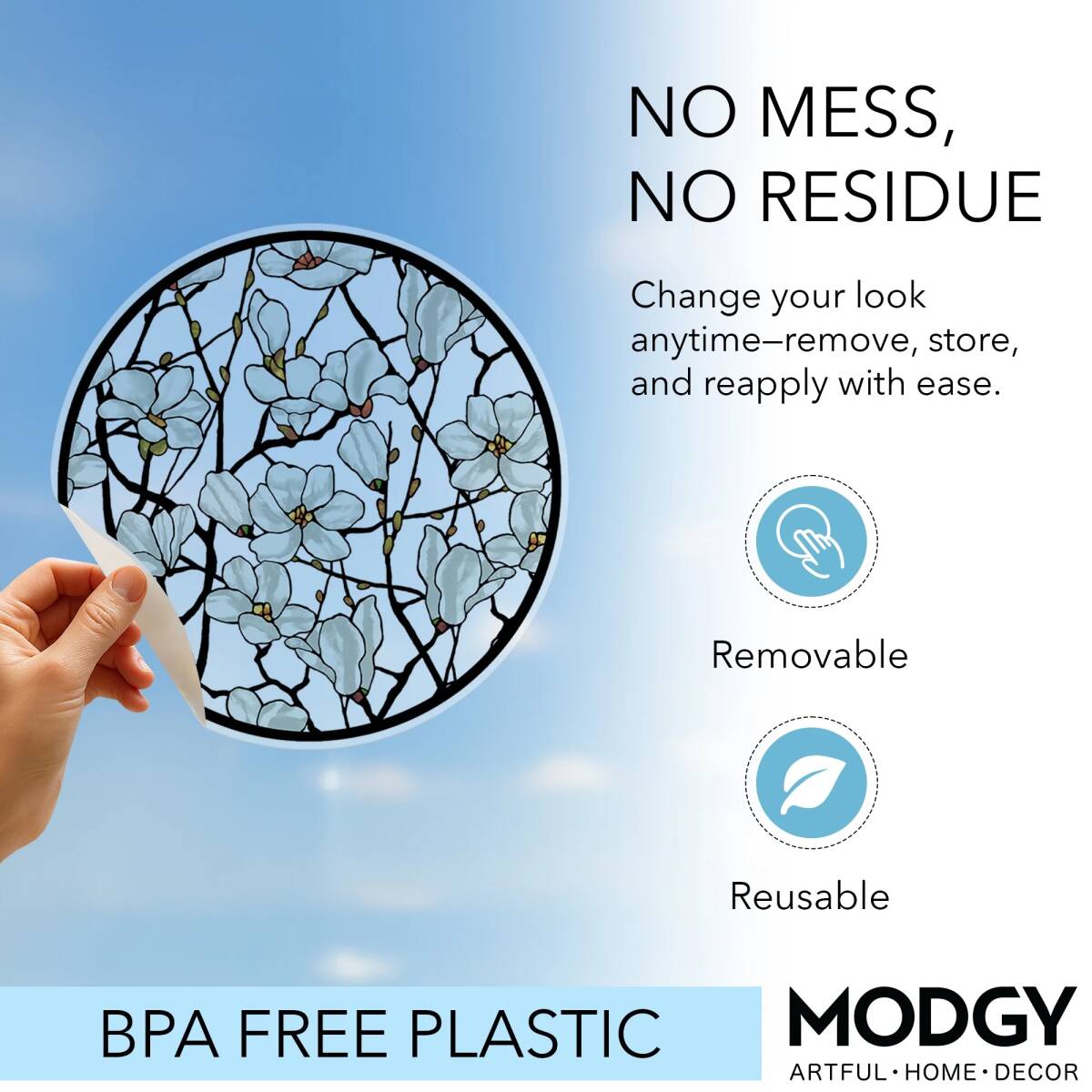 Modgy Window Clings bring art and style to your windows with vibrant, repositionable designs that transform sunlight into colorful displays. Each pack includes three unique designs, perfect for mixing, matching, or spreading throughout your space. Easy to apply—just peel and press—they cling without adhesives and leave no residue. Reusable and removable, they’re ideal for adding privacy, personality, and a pop of color to any glass surface at home, in the office, or in the classroom.