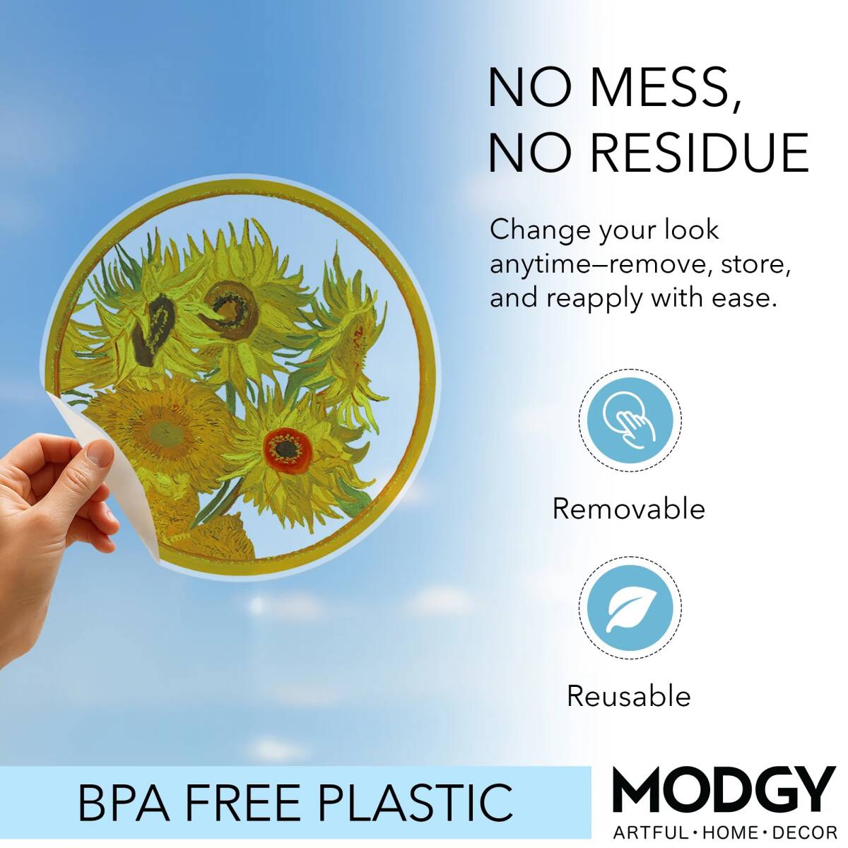 Modgy Window Clings bring art and style to your windows with vibrant, repositionable designs that transform sunlight into colorful displays. Each pack includes three unique designs, perfect for mixing, matching, or spreading throughout your space. Easy to apply—just peel and press—they cling without adhesives and leave no residue. Reusable and removable, they’re ideal for adding privacy, personality, and a pop of color to any glass surface at home, in the office, or in the classroom.