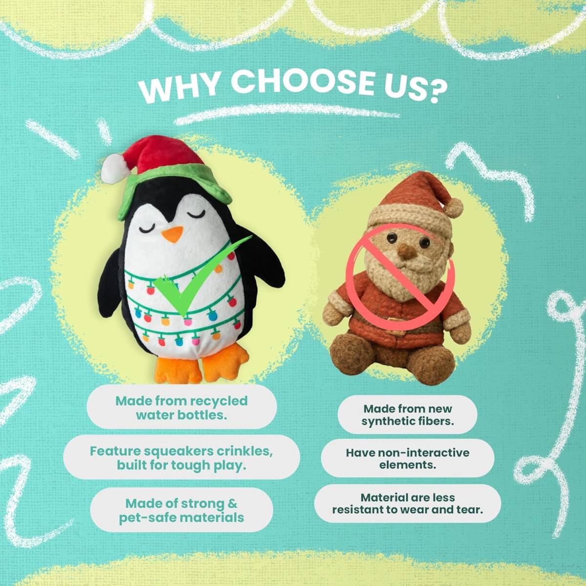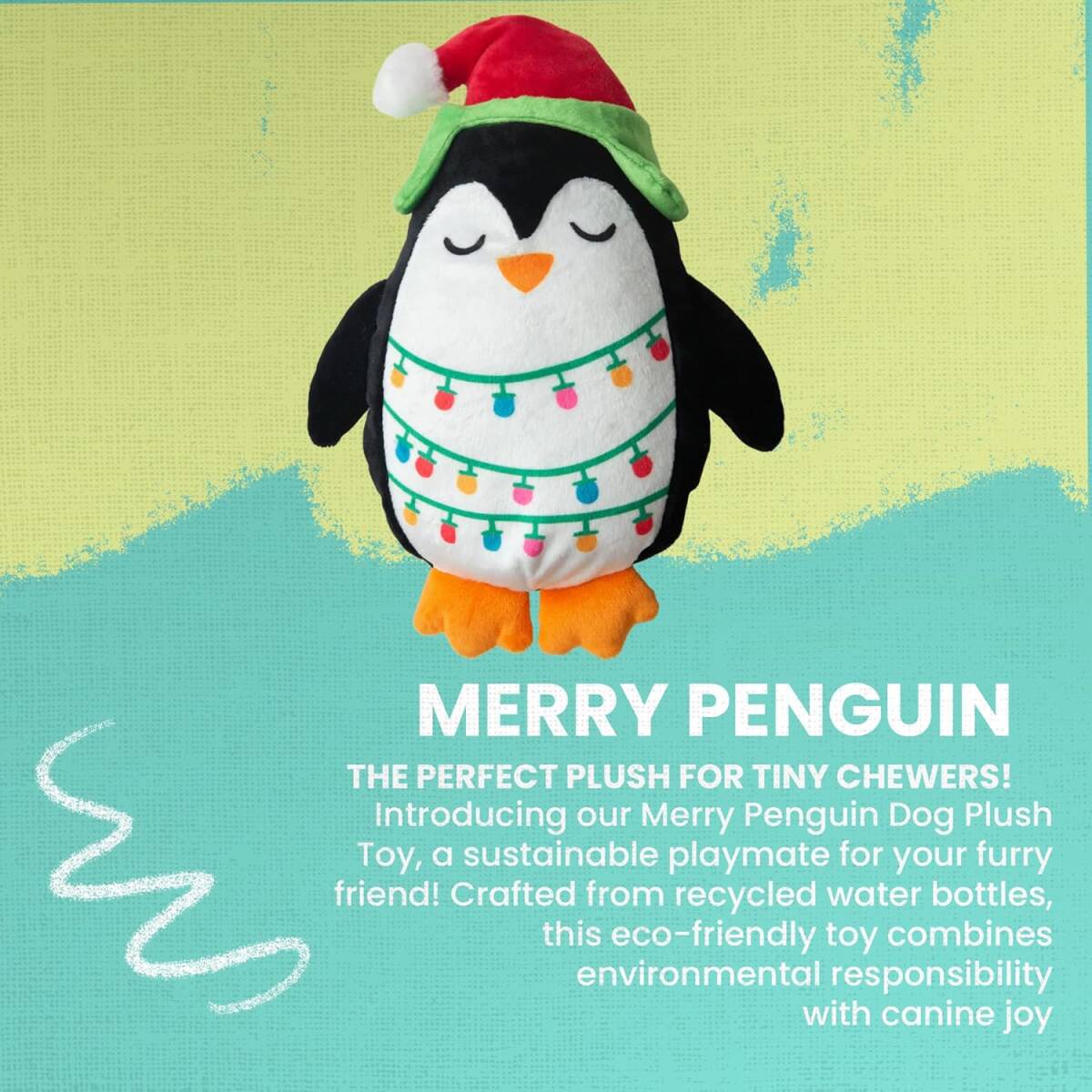 Introducing our Merry Penguin Dog Plush Toy, a sustainable playmate for your furry friend! Crafted from recycled water bottles, this eco-friendly toy combines environmental responsibility with canine joy. The soft and durable design ensures hours of delightful play, while the charming penguin shape adds a festive touch to your pet's playtime. Contains crinkle & squeaker. Treat your dog to a companion that's not only fun but also kind to the planet. Happy play, happy planet – that's the Merry Penguin promise! Measures 6" tall.