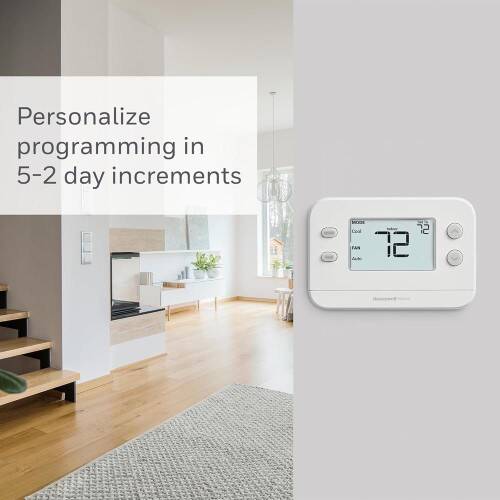 Experience effortless home comfort tailored to your routine with the Honeywell Home X2P Programmable Thermostat. Designed for homeowners who value simplicity and reliability, the X2P offers a straightforward solution for managing your home's temperature. Its standout feature is the flexible 5-2 day programming, allowing you to create distinct heating and cooling schedules for weekdays and weekends. This adaptability ensures your comfort aligns perfectly with your lifestyle. For those times when you prefer manual adjustments, the scheduling feature can be easily turned off, providing "Simply Better" comfort that adapts to your immediate needs.