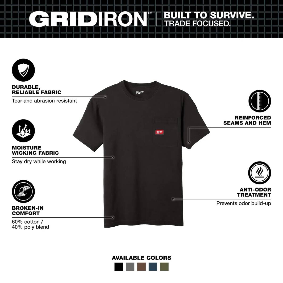 Part of the MILWAUKEE® GRIDIRON™ Collection, our Short Sleeve Pocket Tee is BUILT TO SURVIVE. Our Pocket Tees are built from durable, reliable fabric for ALL DAY PROTECTION to OUTLAST THE JOB. This short sleeve t-shirt is engineered for broken-in comfort on day one and continues to get better over time. Designed with a relaxed fit for plenty of room to move. Our moisture wicking and anti-odor technologies make the Heavy Duty Pocket T-Shirt a go-to any time of year.