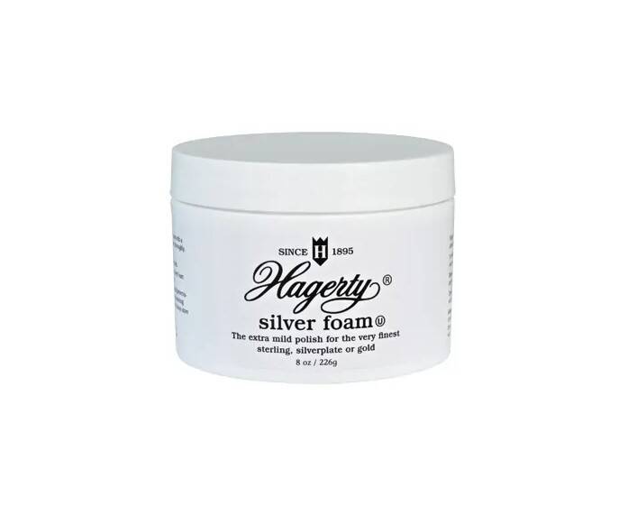 Hagerty Silver Foam makes cleaning and polishing sterling silver, silver plate, and gold easy with our simple wash, rinse and dry method. Powerful foaming action lifts away residue, removes light tarnish, and maintains patina on any item from jewelry to flatware. Developed in 1895 by our founder, William J. Hagerty, this mild polish has been trusted to care for silver treasures and heirlooms for more than 120 years.