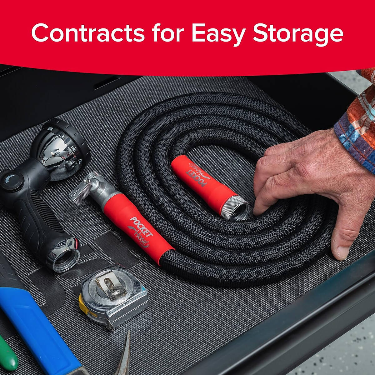- CONTRACTS: Turn off the water and watch the Pocket Hose Silver Bullet shrink right back to pocket size, making it super-easy to store anywhere