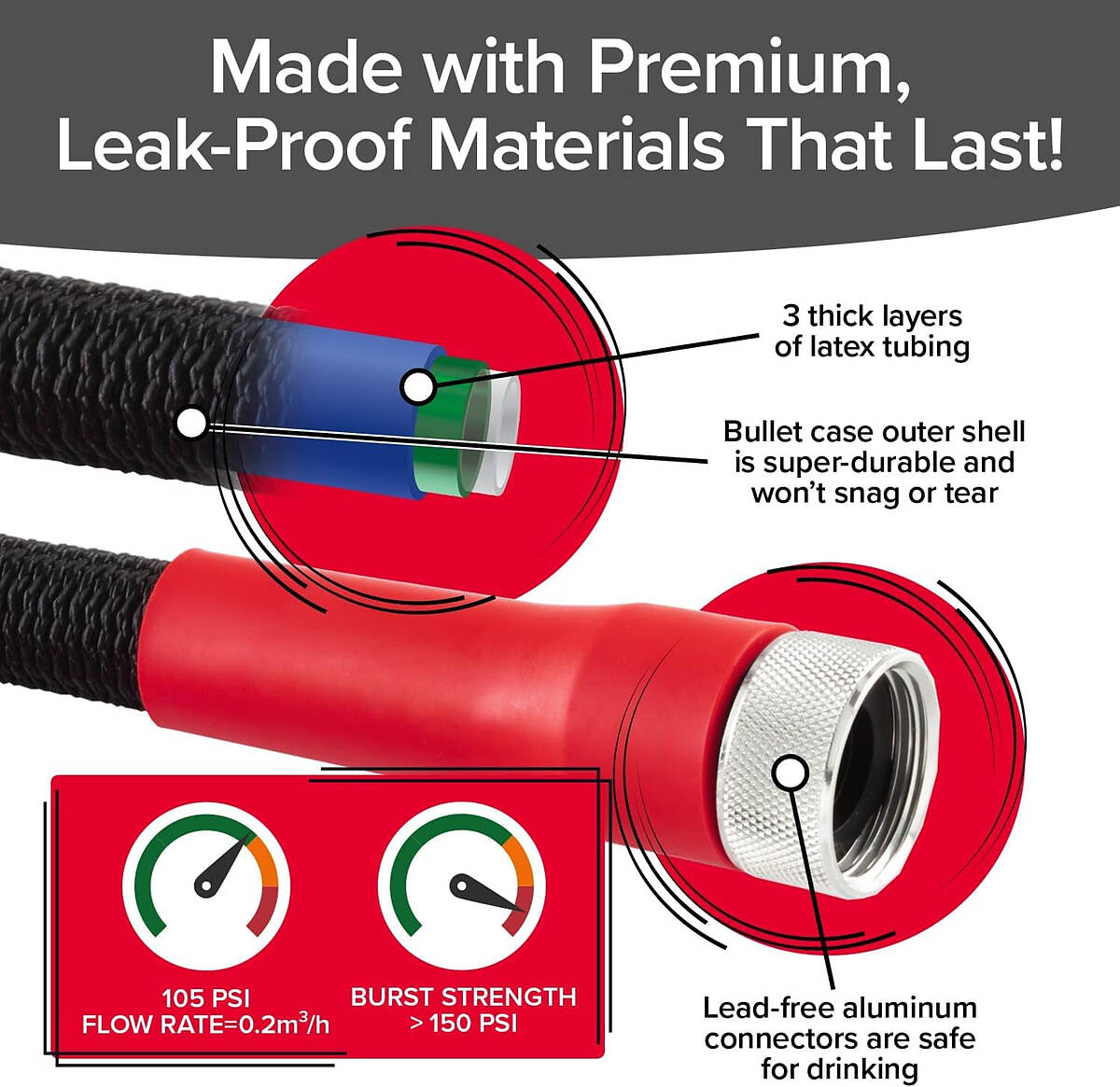 - STRONG: Pocket Hose Silver Bullet’s interior hose is made of 3 layers of High-Strength Latex to prevent bursts, leaks, and kinks!